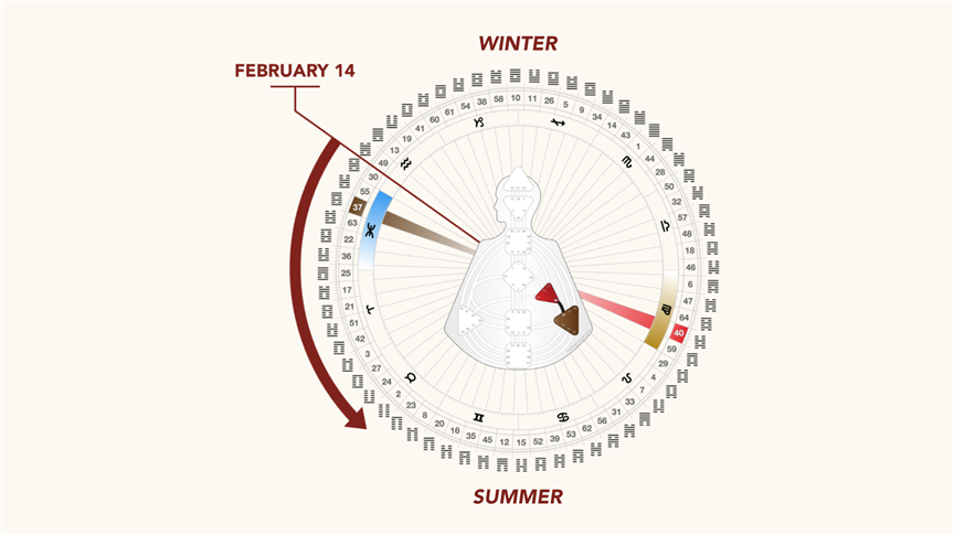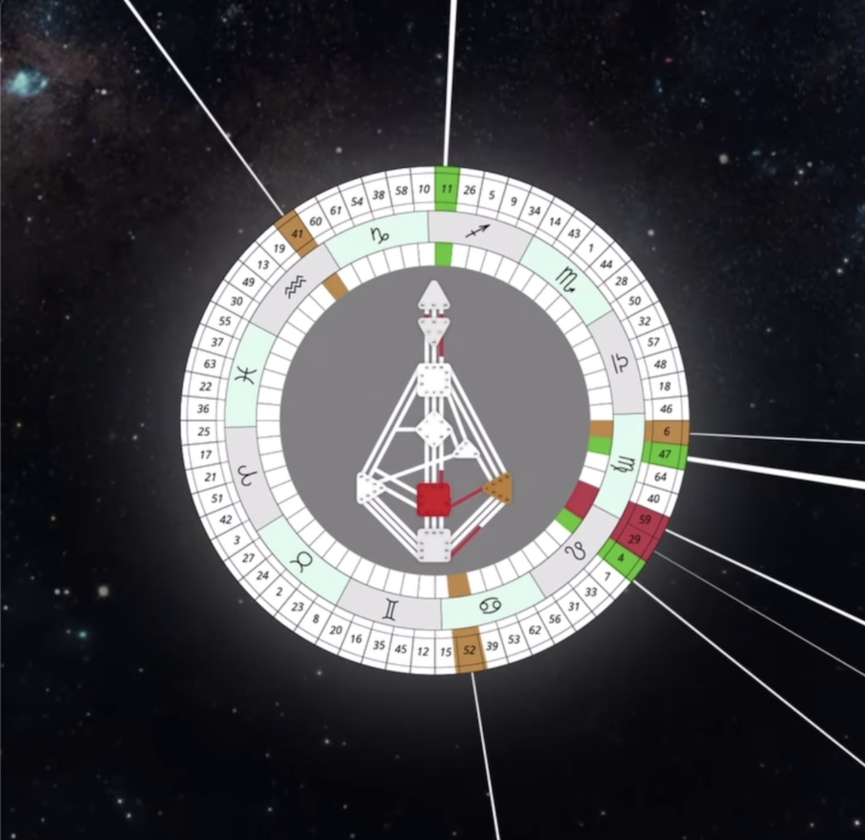 The calendar is read counter-clockwise and begins each year with hexagram 41 on the Chinese New Year, January 22, 2023. The hexagrams are also know as Gene Keys and gates in Human Design